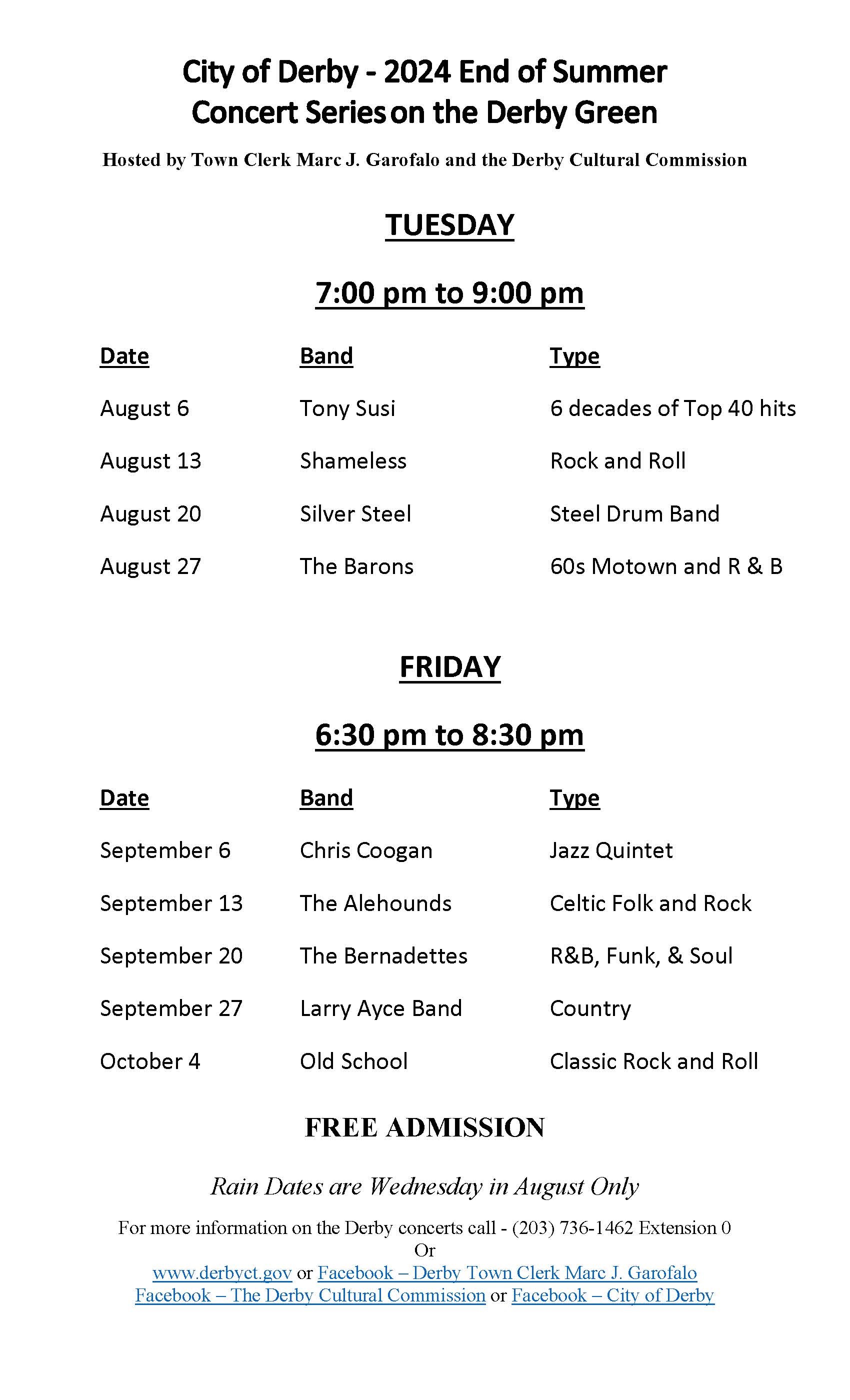 | Tuesday, September 3 7:00 PM | Summer Concert on the Green | |