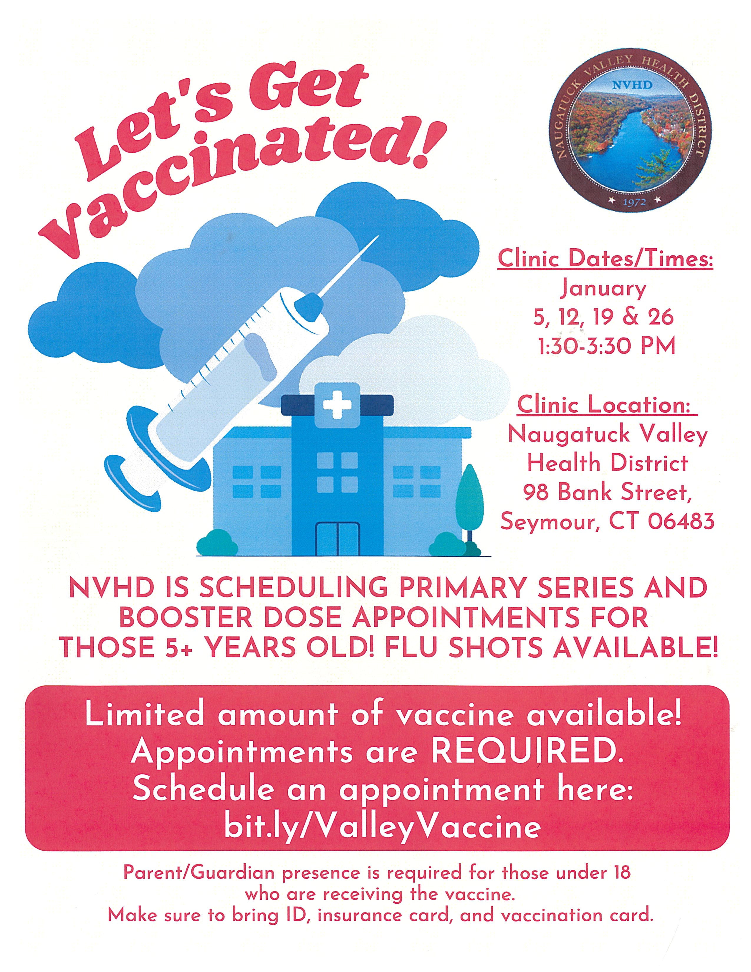 | Tuesday, January 12 7:00 PM | Naugatuck Valley Health District - Board of Directors - Regular Meeting | For more information visit https://www.nvhd.org/about/board-of-directors/ by clicking below