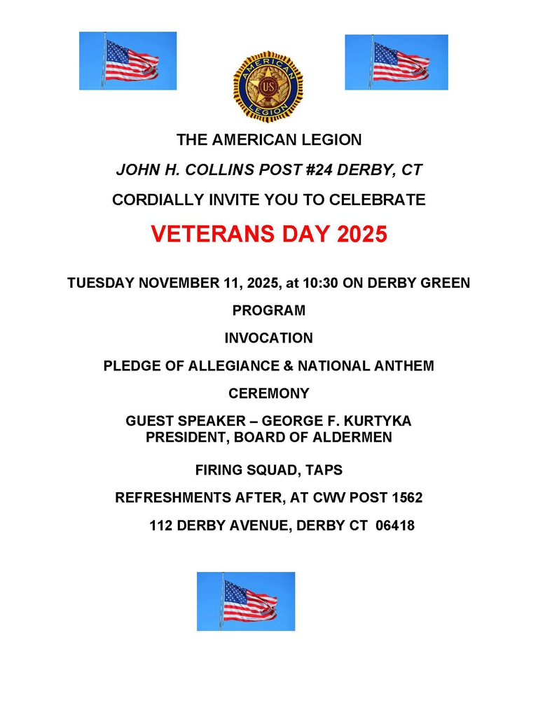 Veterans Day Ceremony - Tuesday November 11, 2025 at 10:30 am - Derby Green